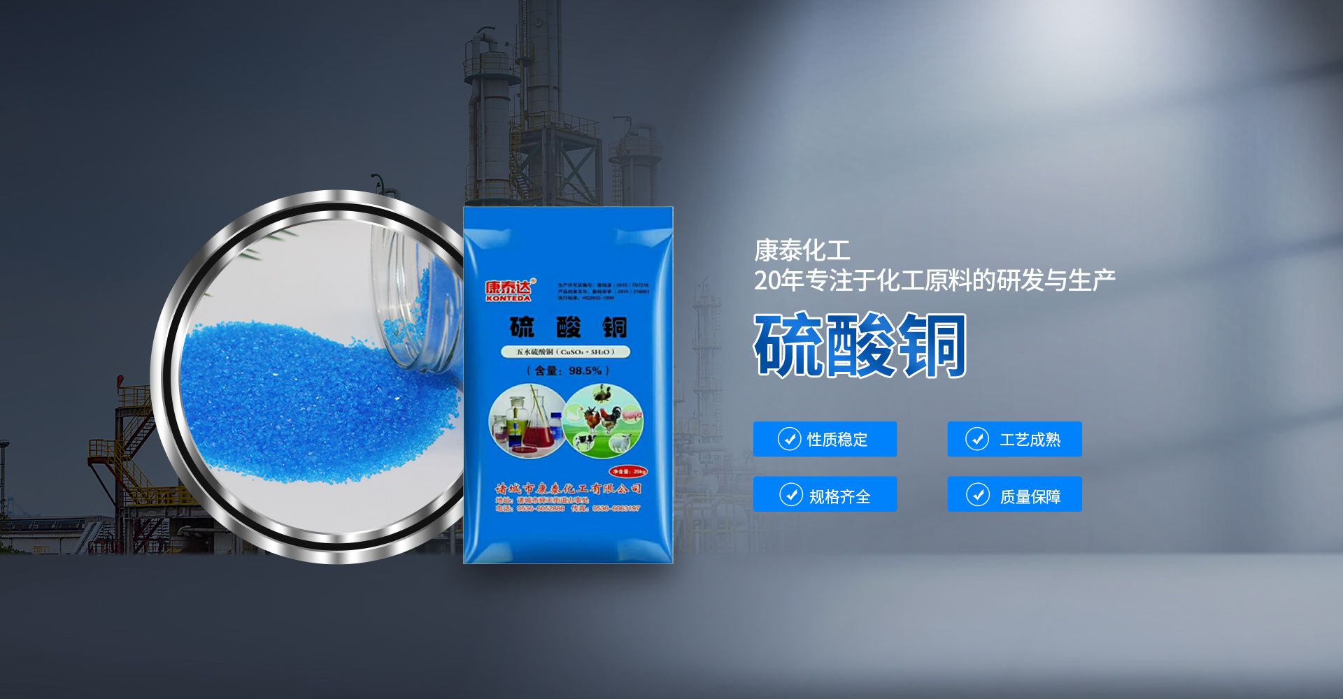 諸城市康泰化工有限公司是集科工貿(mào)于一體的綜合性高科技生產(chǎn)企業(yè)。公司坐落在中國龍城——山東省諸城市,地理位置優(yōu)越,交通便利。主要產(chǎn)品有:硫酸銅、堿式硫酸銅、堿式氯化銅、醋酸銅、氫氧化銅、堿式碳酸銅、氧化銅、硝酸銅、氯化銅等銅鹽產(chǎn)品,硫酸錳、硫酸鋅、硫酸亞鐵、硫酸鎂等硫酸鹽產(chǎn)品以及氧化鋅、碳酸錳等產(chǎn)品,主要應用于...